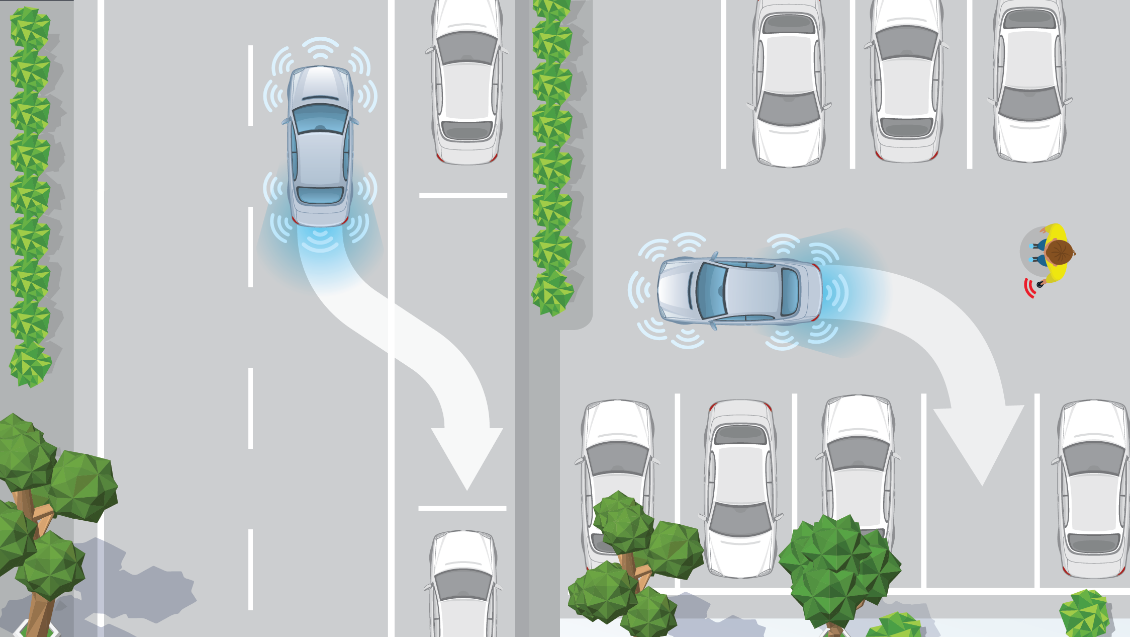 2. Conduzca lentamente (a menos de 19 km/h) para buscar un espacio de estacionamiento, manteniéndose cerca (aproximadamente a 90 cm) del lado deseado. Aparecerá una notificación en la pantalla de infoentretenimiento cuando se detecte un espacio.