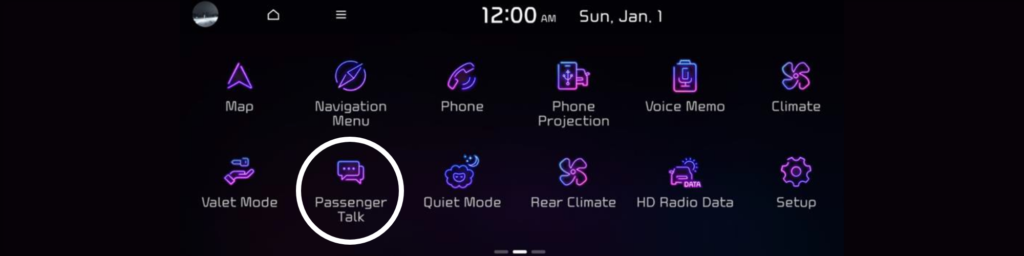 Verifique que el ícono “Passenger Talk” esté visible en la pantalla del menú del sistema de infoentretenimiento, como en la imagen a continuación.