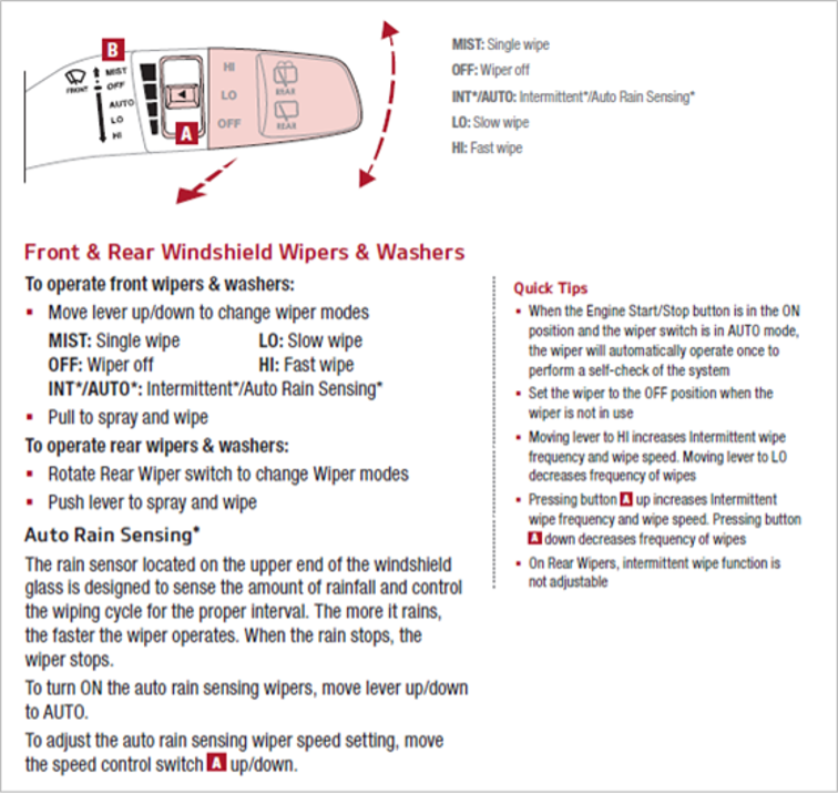 Publicaciones de KIA P2M Favorito Funcionamiento del limpiaparabrisas y modo de servicio Las características pueden variar Ayude a familiarizar a sus clientes con el funcionamiento básico de los limpiaparabrisas delanteros y traseros y muéstreles cómo utilizar las funciones de detección automática de lluvia y modo de servicio de limpiaparabrisas. Limpiaparabrisas delanteros y traseros y funcionamiento automático con sensor de lluvia En algunos modelos, el modo limpiaparabrisas también se puede mostrar en el panel de instrumentos. Los clientes pueden activar o desactivar esta función en el menú de configuración del usuario. Modo de servicio de limpiaparabrisas Descripción general Los limpiaparabrisas de algunos modelos 2024 (incluidos Telluride, Sorento, Sportage, Niro, EV6, Stinger, Carnival, K5, Forte y EV9) están empotrados debajo del capó o el alerón trasero para mejorar su apariencia y reducir el ruido del viento. Para acceder a los limpiaparabrisas y evitar dañar la pintura del capó, estos vehículos requieren que se active el modo de servicio al limpiar el parabrisas, inspeccionar o cambiar las escobillas, o al levantar los limpiaparabrisas en condiciones de nieve o hielo. Consulte también el Manual del propietario y la Guía de características y funciones (FFG) para obtener instrucciones sobre cómo levantar las escobillas del limpiaparabrisas. Operación – Levantar limpiaparabrisas Gire el encendido del vehículo a la posición ON con el motor APAGADO y luego gire el encendido a la posición OFF.Dentro de los 20 segundos después de girar el encendido a la posición OFF (APAGADO), levante la palanca de control de las escobillas del limpiaparabrisas y manténgala así durante más de 2 segundos.Los brazos del limpiaparabrisas delantero se moverán hacia arriba y se detendrán en posición vertical (C). En los modelos Sorento, Carnival, EV9 y Sportage 2024, el limpiaparabrisas trasero también se moverá simultáneamente hacia abajo. Ahora se pueden alejar los brazos del limpiaparabrisas del parabrisas para limpiarlos o reemplazarlos y volver a colocarlos en el parabrisas cuando haya terminado. Operación – Limpiaparabrisas inferiores Gire el encendido del vehículo a la posición ON con el motor APAGADO.Mueva la palanca de control de las escobillas limpiaparabrisas hacia arriba para regresar los limpiaparabrisas a la posición de “estacionamiento”.Apague el encendido. Mira el Limpiaparabrisas de elevación/Modo de servicio de limpiaparabrisas Video para aprender más y explicar cómo funcionan los limpiaparabrisas a sus clientes durante la entrega o la visita de servicio. Este video está disponible para verlo en cualquier momento y puede compartirse con los clientes. Atentamente,Equipo de Experiencia de PropiedadKia América, Inc. Experiencia del cliente La satisfacción del cliente Entrega IQS Modo de servicio de limpiaparabrisas Ventas Servicio Más publicaciones sobre Kia P2M