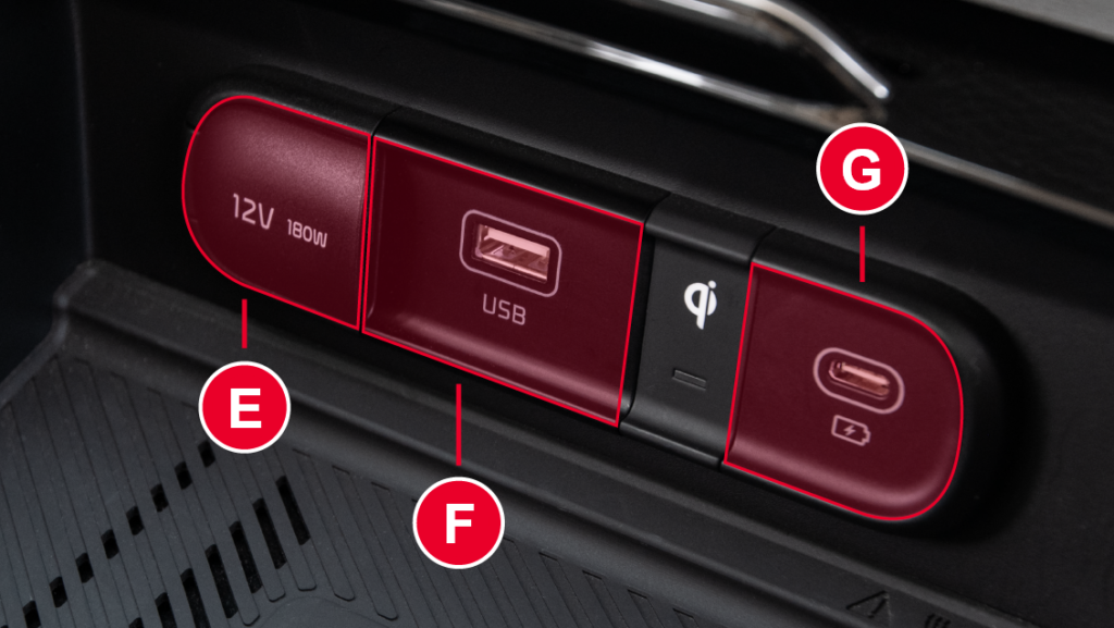 • 12V Power Outlet (D): Labeled 12V, it powers compatible devices requiring 12 volts. Push down on the button to open/close the outlet door (availability varies by vehicle).