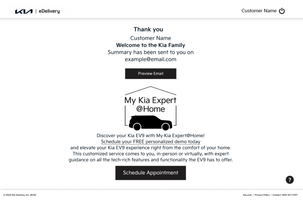 KIA P2M Posts Favorite My Kia Expert@Home* Scheduler NOW LIVE! Exciting EV9 news—the My Kia Expert@Home* appointment scheduler is now live in the Kia eDelivery Tool! Launched in February 2024, My Kia Expert@Home* offers EV9 customers a personalized Delivery and follow-up features demonstration in the comfort of their home or office, in-person or virtually. In-person demonstrations are only available in participating cities. This post-sale experience supports and reinforces all your hard work in the Dealership. The Kia eDelivery Tool appointment scheduler will help make it easier for you and your customers to schedule their My Kia Expert@Home* demonstration and may even improve your survey scores. 94% of EV9 customers who have already had their complimentary experience reported a more favorable opinion of Kia, with 95% of customers reporting that they are more likely to purchase another vehicle when this service is offered. That could mean more business for you and even better SEI scores! Make sure to help every EV9 customer schedule their complimentary My Kia Expert@Home* experience at the end of the Kia eDelivery process on the Thank You confirmation page by selecting Schedule Appointment. From there, customers will be able to: Confirm the appointment location (in-person or virtual).Select a time and date for their one-hour Delivery appointment up to 30 days out.Select up to six features and functions they want the My Kia Expert to cover during the appointment.Opt-in to receive SMS text messages about their appointment.Review details and confirm their appointment. After confirming their appointment, customers will receive appointment details and reminders via email and SMS texts (if opted in). If EV9 customers can’t schedule an appointment at Delivery, Sales Consultants can share the My Kia Expert@Home* contact information with their customers to book directly: Call/Text: 844-725-6100Email: Concierge@Kia-At-Home.comEV9 customers can change their appointment by contacting the My Kia Expert@Home* Concierge at least 24 hours before their appointment by emailing Concierge@Kia-At-Home.com or calling/texting 310-929-0628.Note: The My Kia Expert@Home* premium service is available to new EV9 owners who purchase or lease their EV9 at a participating Kia dealer. Live demonstrations of the EV9 are available nationwide—either in-person or virtually (depending on location)—through December 31, 2024. For more information, check out the My Kia Expert@Home* eDelivery Quick Reference Guide available on KDealer+ or download it here: Quick Reference Guide.Get a jump start on your survey scores by incorporating My Kia Expert@Home* in your EV9 deliveries today! Note: The My Kia Expert@Home* premium service is available to new EV9 owners who purchase or lease their EV9 at a participating Kia dealer. Live demonstrations of the EV9 are available nationwide—either in-person or virtually (depending on location)—through December 31, 2024. * Important Safety Information and Legal Disclaimers can be found in the link at the bottom of the page. EV EV9 Kia eDelivery Tool My Kia Expert@Home Sales More Kia P2M Posts