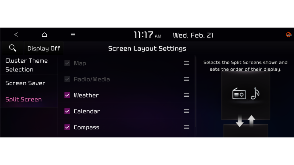 KIA P2M Posts Favorite Split Screen Settings Simulated screen shown. Available on all models with the AVN 5.0 Wide head unit*, Apple CarPlay®* and Android Auto™* split screen enables customers to display various information simultaneously such as the map, radio/media info, driving info, clock, and fuel economy/electric motor use (on PHEV/EV models). Activating the Split Screen Option Select SetupSelect Device ConnectionsSelect Phone Projection SettingsSelect Android Auto™* or Apple CarPlay®*Select Use Split Screen on Android Auto™* / Apple CarPlay™* Screen Select and Reposition Items on the Split Screen Select SetupSelect Screen Layout or Screen Theme/LayoutSelect Split Screen Opening the Split Screen and Customizing the Layout To open the split screen, press the split screen button on the right of the screen: To select your desired screen, swipe the screen up or down: Whether you’re delivering a new vehicle or assisting at the service drive, knowing how to demo this feature helps you stand out. Customers appreciate when their salesperson is tech-savvy, and this is a perfect chance to build trust and spark excitement! * Important Safety Information and Legal Disclaimers can be found in the link at the bottom of the page. Customer Experience Customer Satisfaction Features and Functions IQS Split Screen Settings Sales Service More Kia P2M Posts