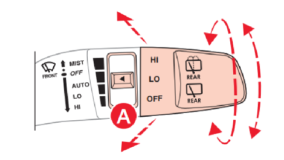 To enable Auto Rain Sensing wipers, move the lever up or down to AUTO and adjust the speed by moving the speed control switch (A) up or down.